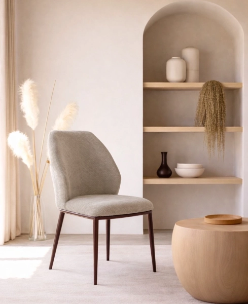 הכסא מגיע מרופד בבד בצבע בז' / קפה לפי בחירה וברגליים בגוון סהרה / אגוז אמריקאי לפי בחירה.